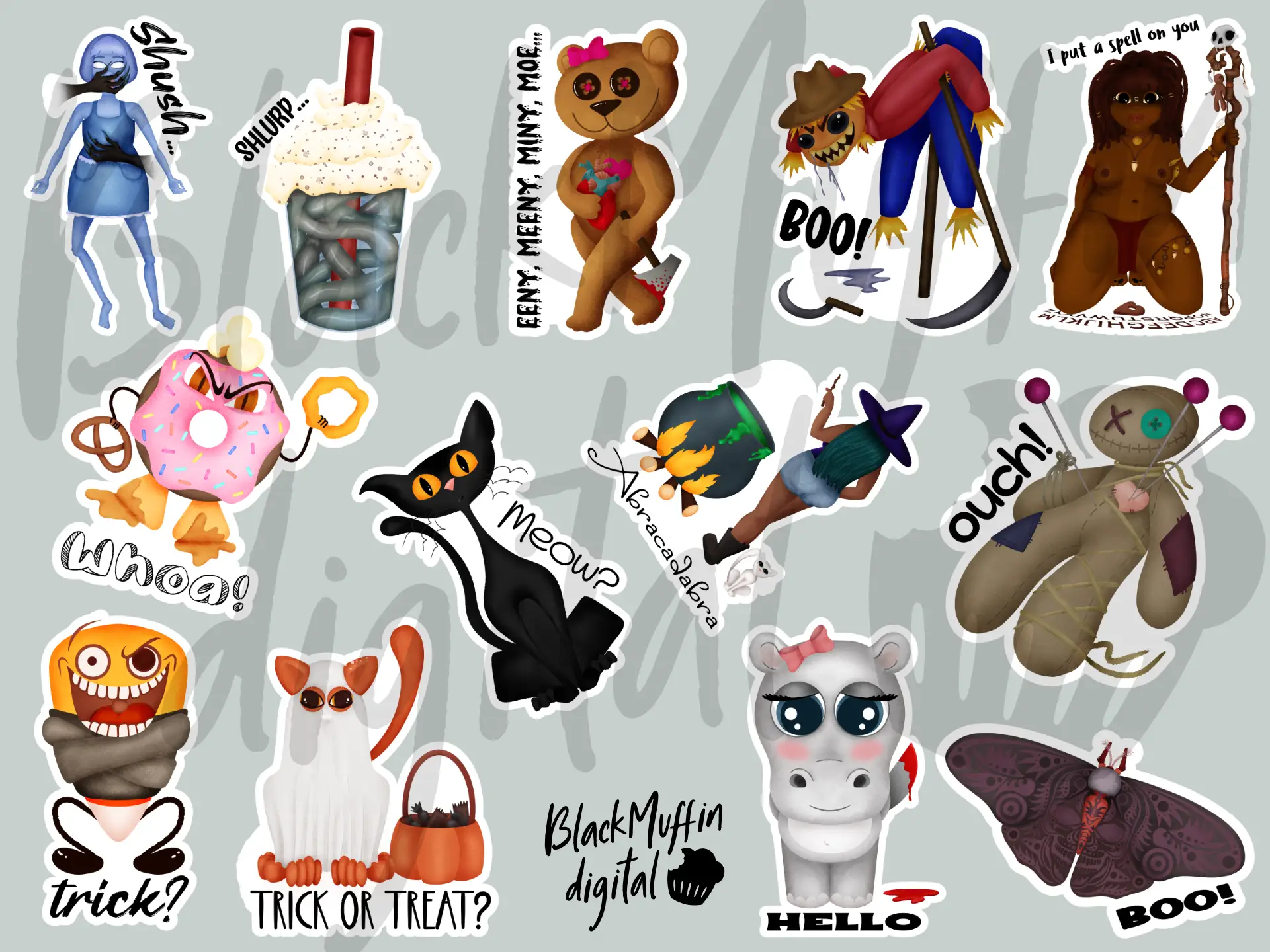 It’s 13 hand drawn cute but scary designs I made while taking part in an art challenge on Instagram. And I thought “why not let them go to waste and share them for free?”. So i went ahead and turned them into juicy stickers. They are one of a kind!